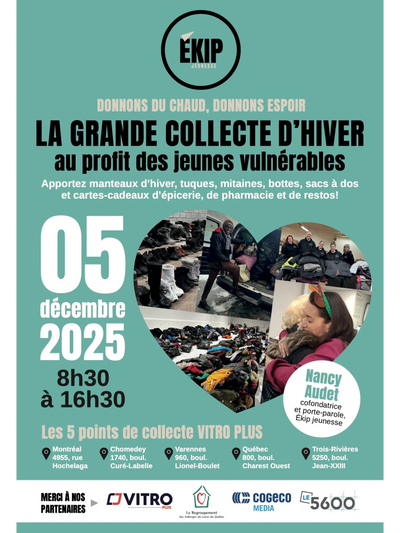 « Grâce à la générosité de nos donateurs, nous avons pu offrir 4 500 manteaux et des centaines de cartes-cadeaux en décembre 2024, réchauffant non seulement le corps, mais aussi le cœur de nombreux jeunes partout au Québec. Cet élan extraordinaire de solidarité nous a permis de soutenir encore plus d’organismes cette année. Merci du fond du cœur à nos bénévoles, nos partenaires, aux médias, et à Jacques Dupras du 5600, Hochelaga. Une reconnaissance toute spéciale à notre fidèle partenaire Cogeco Média — votre engagement donne à cet événement une portée humaine et médiatique inestimable. »